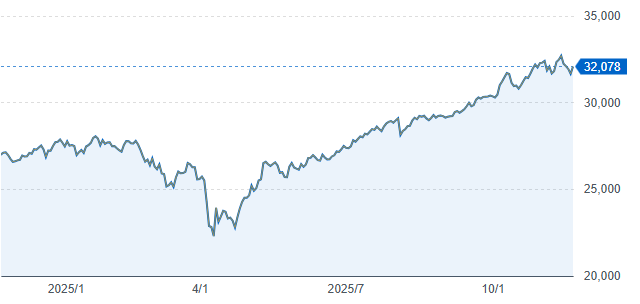 下のグラフは、代表的な「全世界株式インデックスファンド」の過去1年の値動きイメージです。